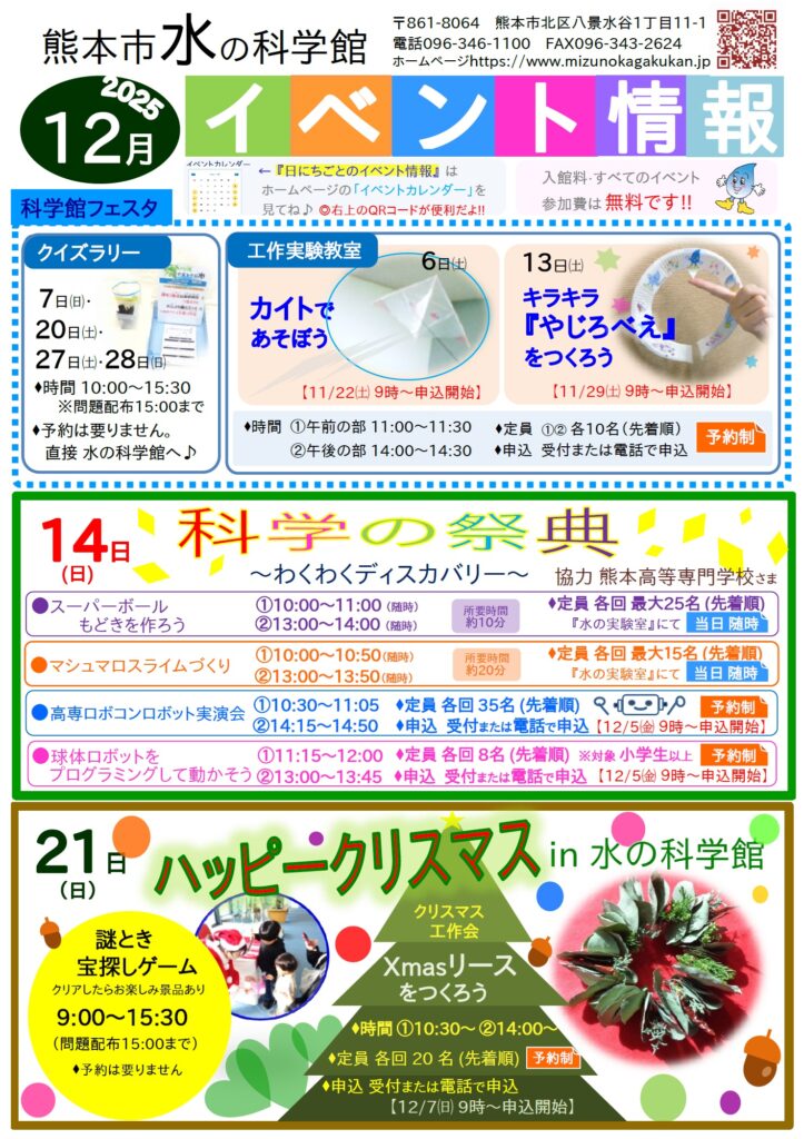 12月のイベント情報 2025年11月17日 お知らせ 12月のイベント情報をお知らせします。 ★科学館フェスタ ■クイズラリー 7(日)、20(土)、27(土)、28(日) ■工作実験教室 6(土)、13(土) ★科学の祭典~わくわくディスカバリー~ 14(日) ★ハッピークリスマスin水の科学館 21(日) 12月イベント情報(印刷用) 前の記事 イベントカレンダー {{ calendarYear }}年{{ calendarMonth }}月 日 月 火 水 木 金 土 {{ date.date }} {{ date.date }} {{hoverDate}} {{hoverTitle}} カテゴリー 全て お知らせ イベント ブログ 月別一覧 2025年10月(6) 2025年11月(11) 2025年9月(15) 2025年8月(25) 2025年6月(26) 2025年5月(17) 2025年4月(15) 2025年3月(12) 2025年2月(13) 2025年1月(13) 2024年12月(21) 2024年11月(8)
