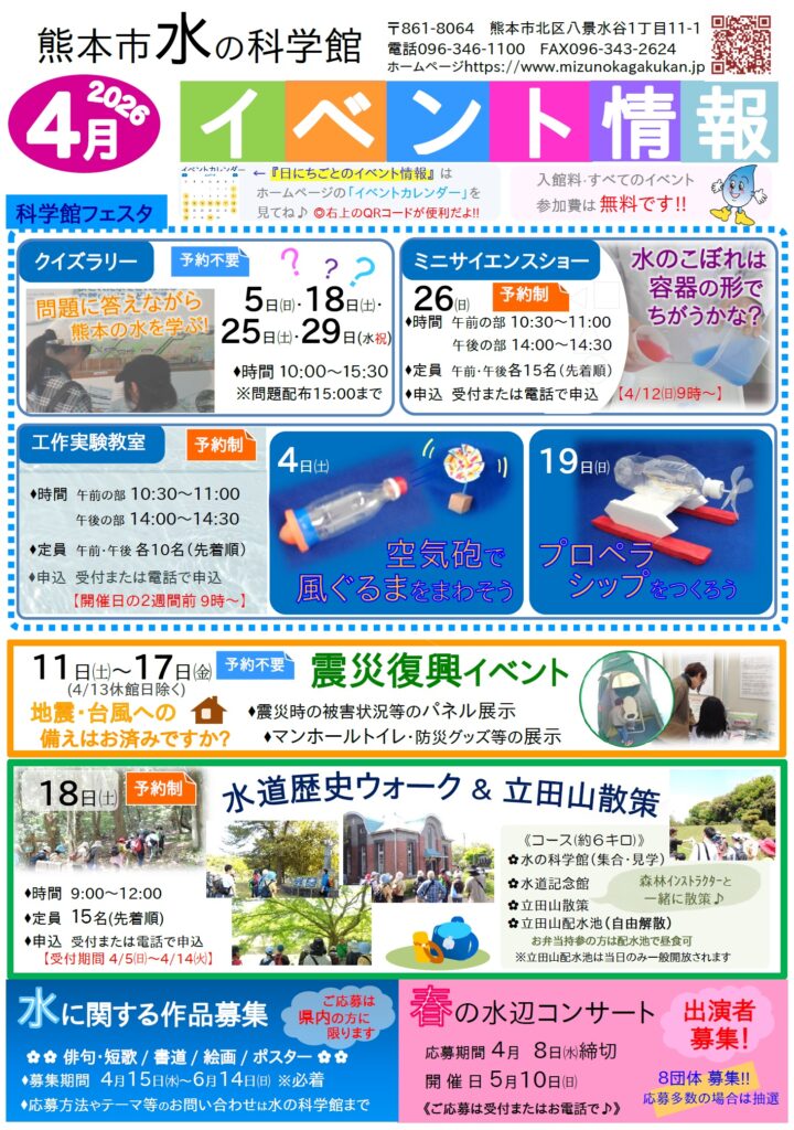 4月のイベント情報 2026年03月16日 お知らせ 4月のイベント情報をお知らせします。 ★科学館フェスタ ■クイズラリー 5(日)、18(土)、25(土)、29(水祝) ■工作実験教室 4(土)、19(日) ■ミニサイエンスショー 26(日) ★震災復興イベント 11(土)~17(金) ★水道歴史ウォーク&立田山散策 18(土) 4月イベント情報(印刷用) 前の記事 イベントカレンダー {{ calendarYear }}年{{ calendarMonth }}月 日 月 火 水 木 金 土 {{ date.date }} {{ date.date }} {{hoverDate}} {{hoverTitle}} カテゴリー 全て お知らせ イベント ブログ 月別一覧 2026年3月(16) 2026年2月(11) 2026年1月(11) 2025年12月(2) 2025年11月(20) 2025年10月(5) 2025年9月(14) 2025年8月(25) 2025年6月(26) 2025年5月(17) 2025年4月(15) 2025年3月(12)