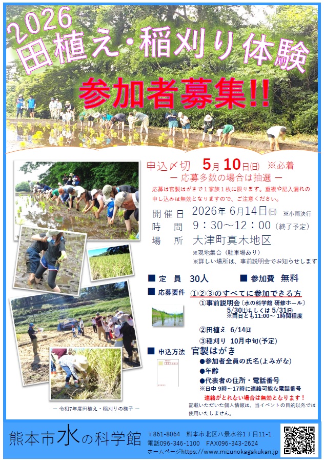 水の科学館では、6月14日(日)に開催される「田植え・稲刈り体験」の参加者を