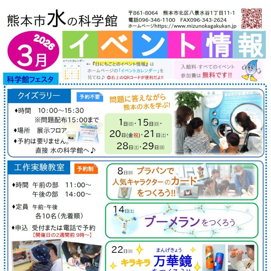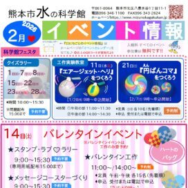 お知らせ お知らせ 2026年02月17日 3月のイベント情報 3月のイベント情報をお知らせします。 ★科学館フェスタ ■クイズラリ... お知らせ 2026年01月14日 2月のイベント情報 2月のイベント情報をお知らせします。 ★科学館フェスタ ■クイズラリ... お知らせ 2025年12月19日 「令和7年度 第3回来館者アンケート調査結果」のお知らせ 熊本市水の科学館では、お客様のご意見・ご要望に対応し、満足度の更なる向上を目指す... お知らせ 2025年12月16日 1月のイベント情報 1月のイベント情報をお知らせします。 ★科学館フェスタ ... お知らせ 2025年11月18日 外池開放のお知らせ 水の科学館『外池』の工事が完了しました。 11月19日(水)より外池を開... お知らせ 2025年11月14日 「令和7年度 第2回来館者アンケート調査結果」のお知らせ 熊本市水の科学館では、お客さまのご意見・ご要望に対応し、満足度の更なる向上を目指... お知らせ 2025年11月08日 遊水池(中池・外池)利用について(Q&A) 遊水池(中池・外池)のご利用について(Q&A) Q 水... お知らせ 2025年10月29日 「水辺写真展」作品募集! 水の科学館では、「水辺写真展」の作品を募集します。 応募締切は、令和7... first 1234 Last イベントカレンダー {{ calendarYear }}年{{ calendarMonth }}月 日 月 火 水 木 金 土 {{ date.date }} {{ date.date }} {{hoverDate}} {{hoverTitle}} カテゴリー 全て お知らせ イベント ブログ 月別一覧 2026年2月(11) 2026年1月(11) 2025年12月(2) 2025年11月(20) 2025年10月(5) 2025年9月(14) 2025年8月(25) 2025年6月(26) 2025年5月(17) 2025年4月(15) 2025年3月(12) 2025年2月(13)